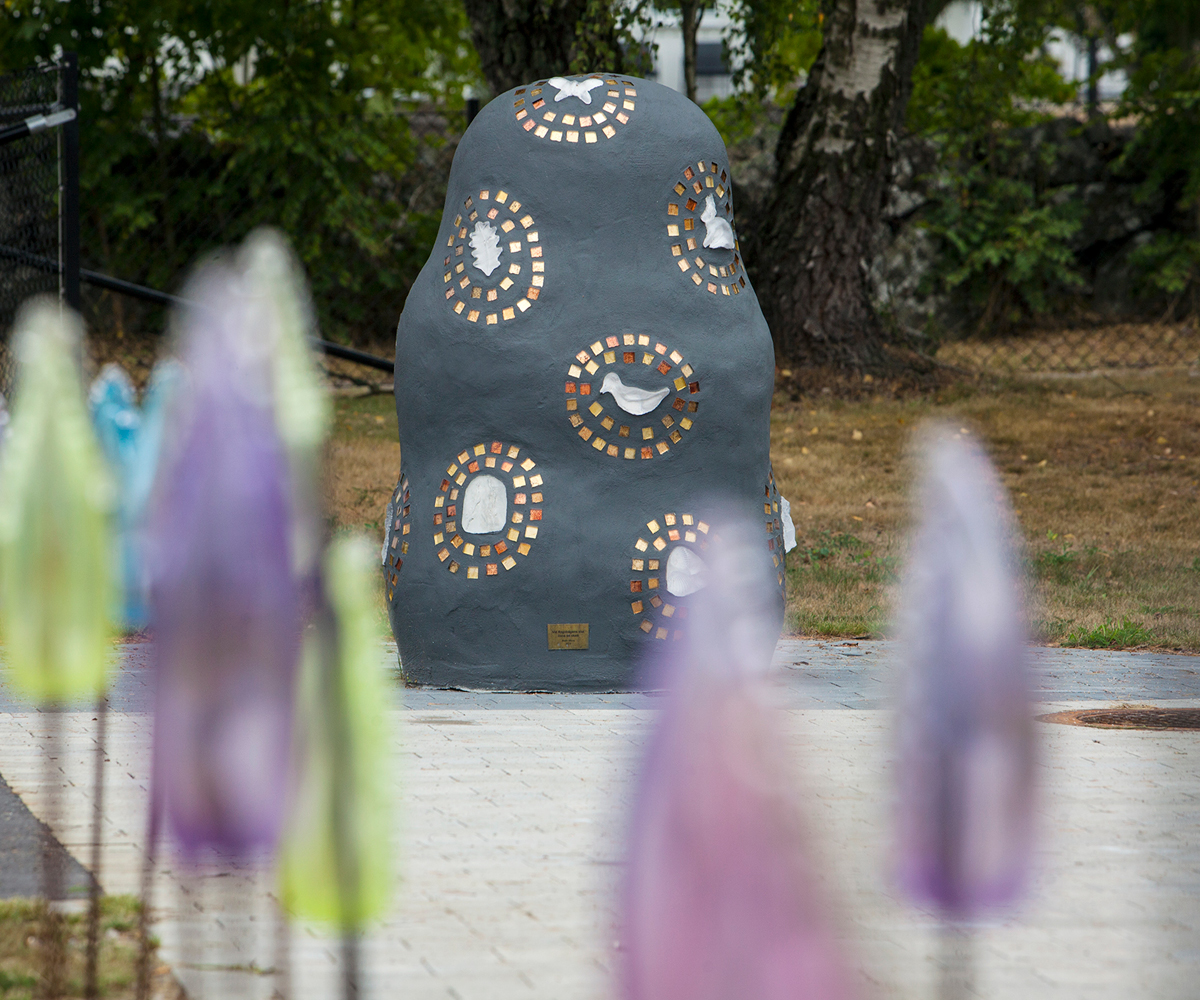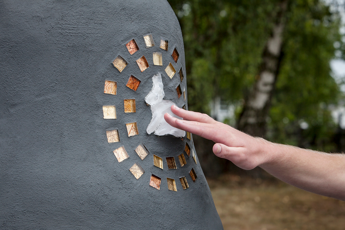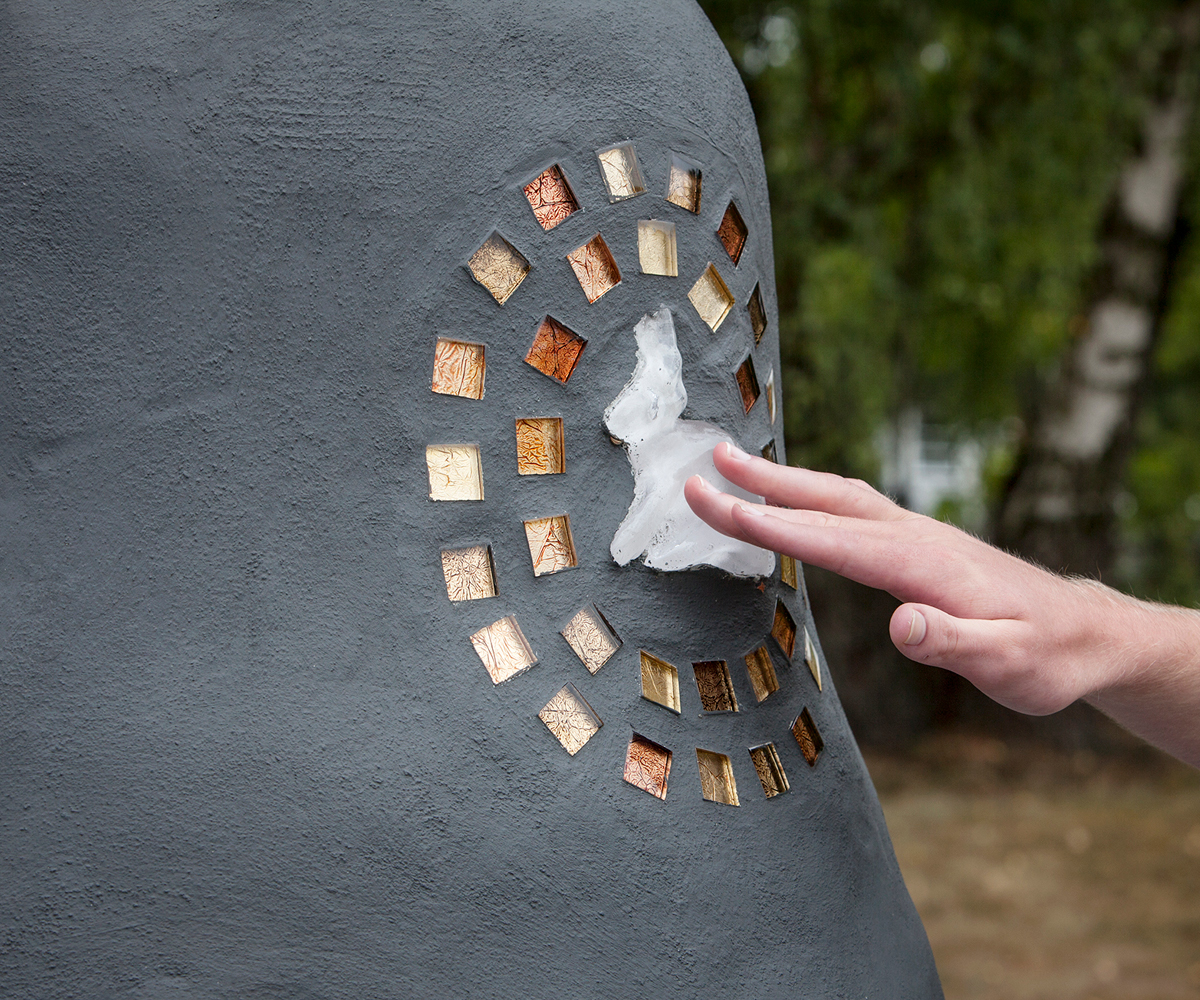 Med detta konstverk ville jag skapa kommunikation och delaktighet för de personer som vistas på den dagliga verksamheten. Detta gjordes genom att låta brukarna själva samla in naturföremål såsom pinnar, stenar, löv och snäckor, men även andra saker som kan symbolisera varje deltagares personliga skatt, exempelvis sitt favoritdjur. Av denna insamlade information gjorde jag avgjutningar i glas och fäste dem på betongskulpturen som små personliga skatter, omringade av guldfärgad kristall-mosaik. Du går genom regnbågsfältet av skimrande glas ner till skatten som får bli en naturlig mötesplats för brukarna.