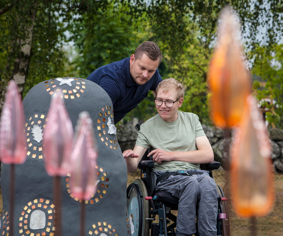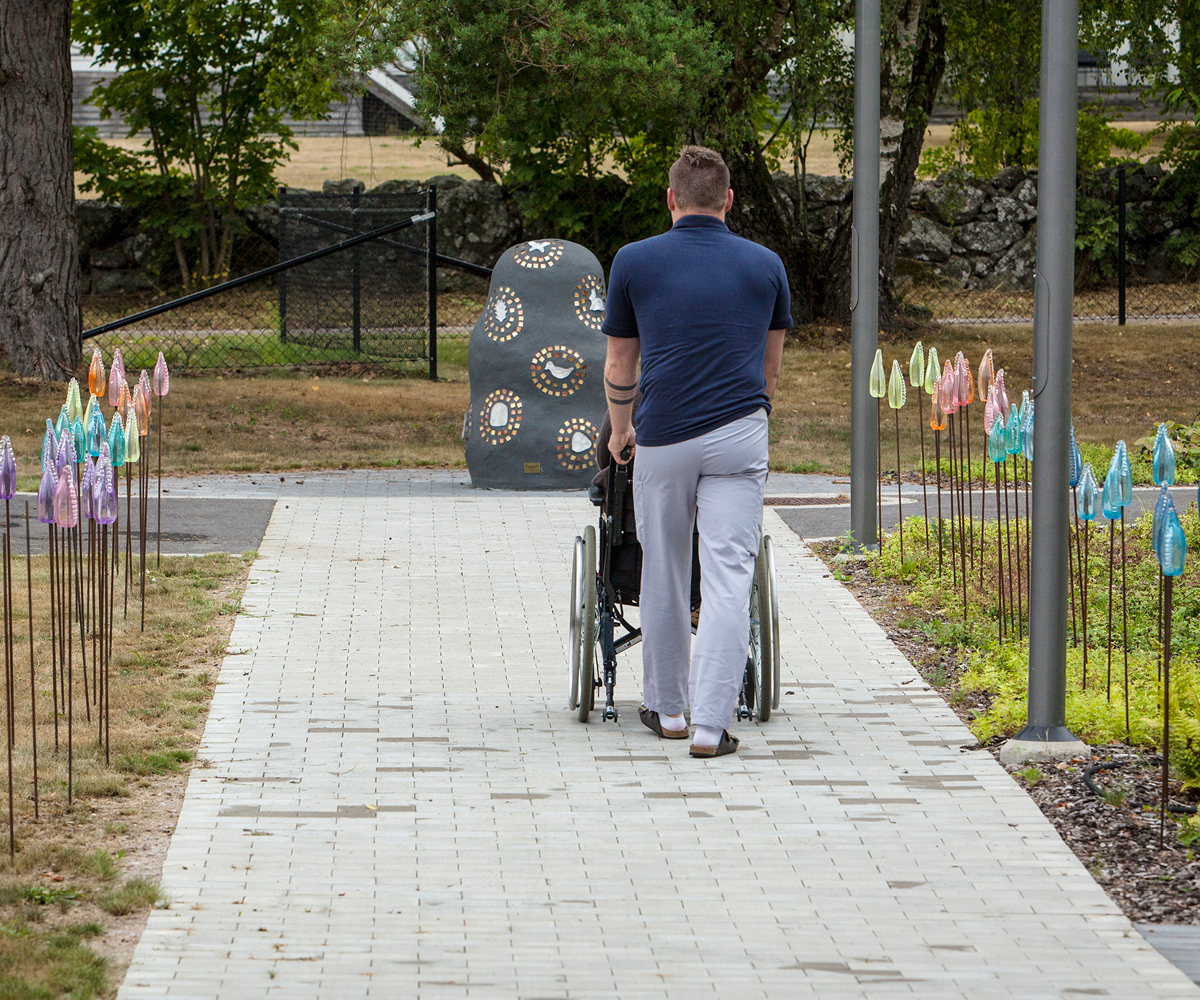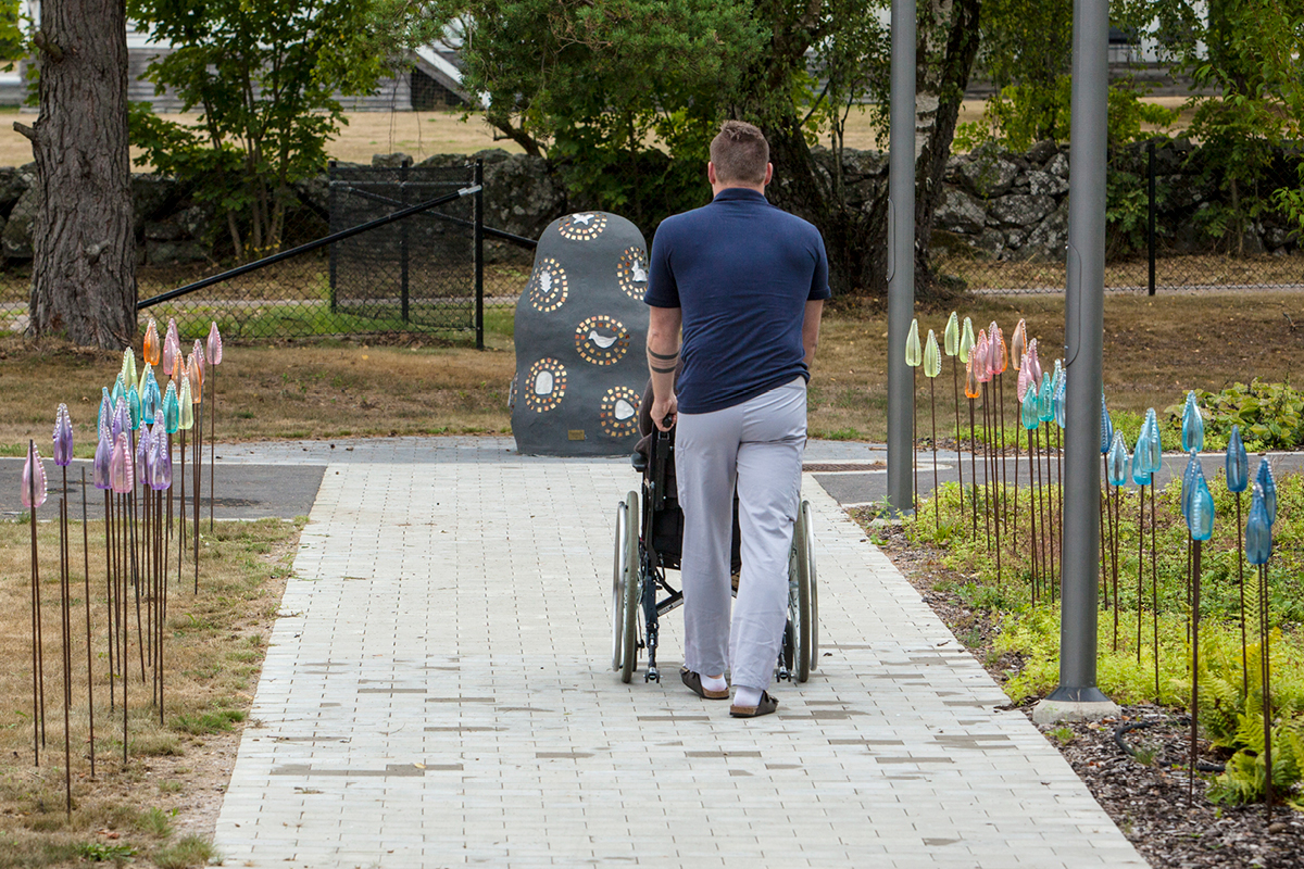 Med detta konstverk ville jag skapa kommunikation och delaktighet för de personer som vistas på den dagliga verksamheten. Detta gjordes genom att låta brukarna själva samla in naturföremål såsom pinnar, stenar, löv och snäckor, men även andra saker som kan symbolisera varje deltagares personliga skatt, exempelvis sitt favoritdjur. Av denna insamlade information gjorde jag avgjutningar i glas och fäste dem på betongskulpturen som små personliga skatter, omringade av guldfärgad kristall-mosaik. Du går genom regnbågsfältet av skimrande glas ner till skatten som får bli en naturlig mötesplats för brukarna.