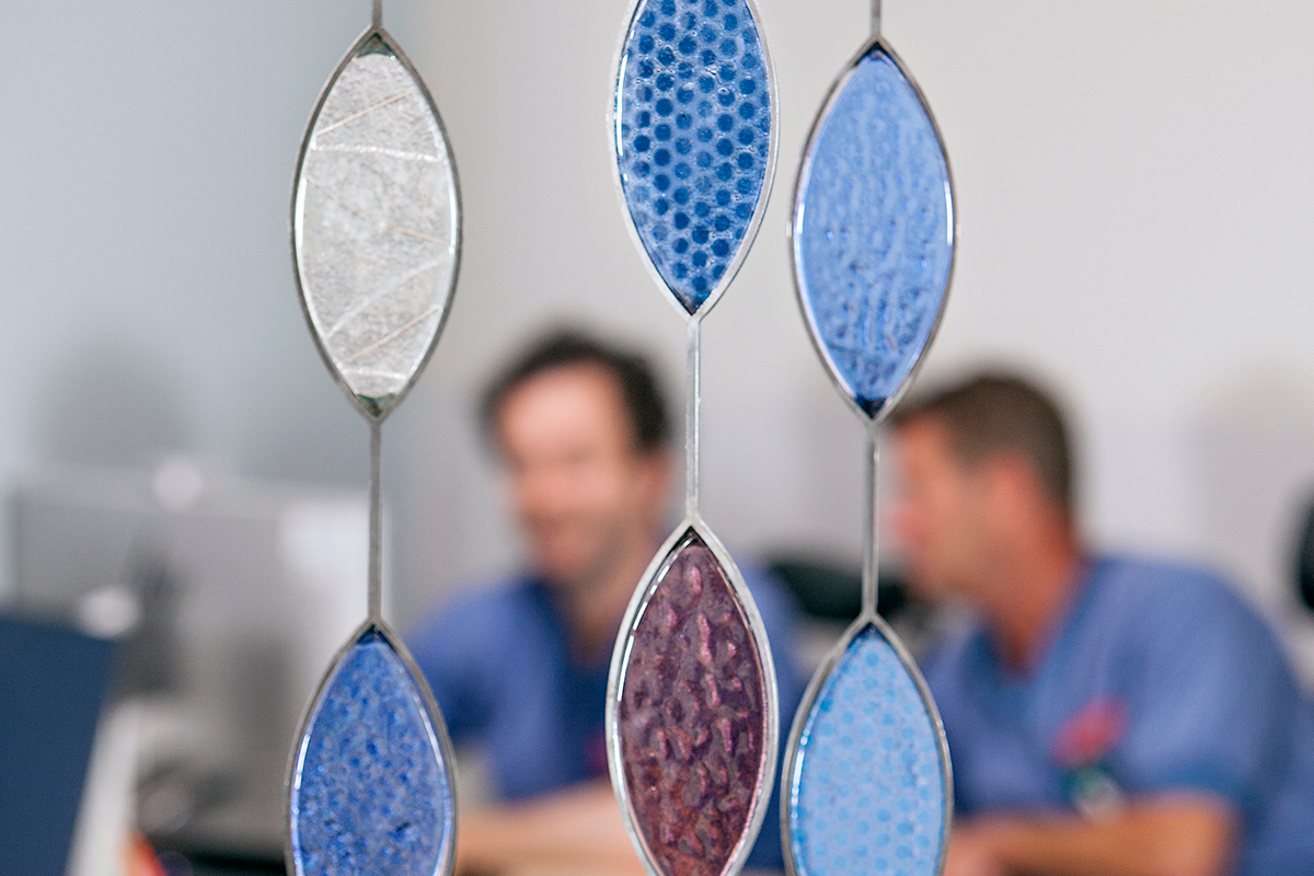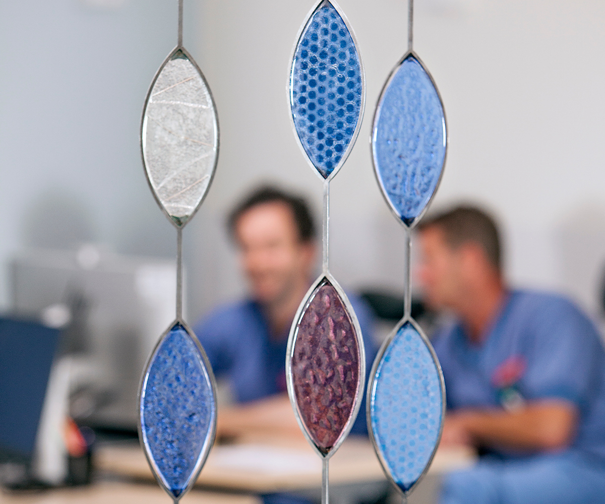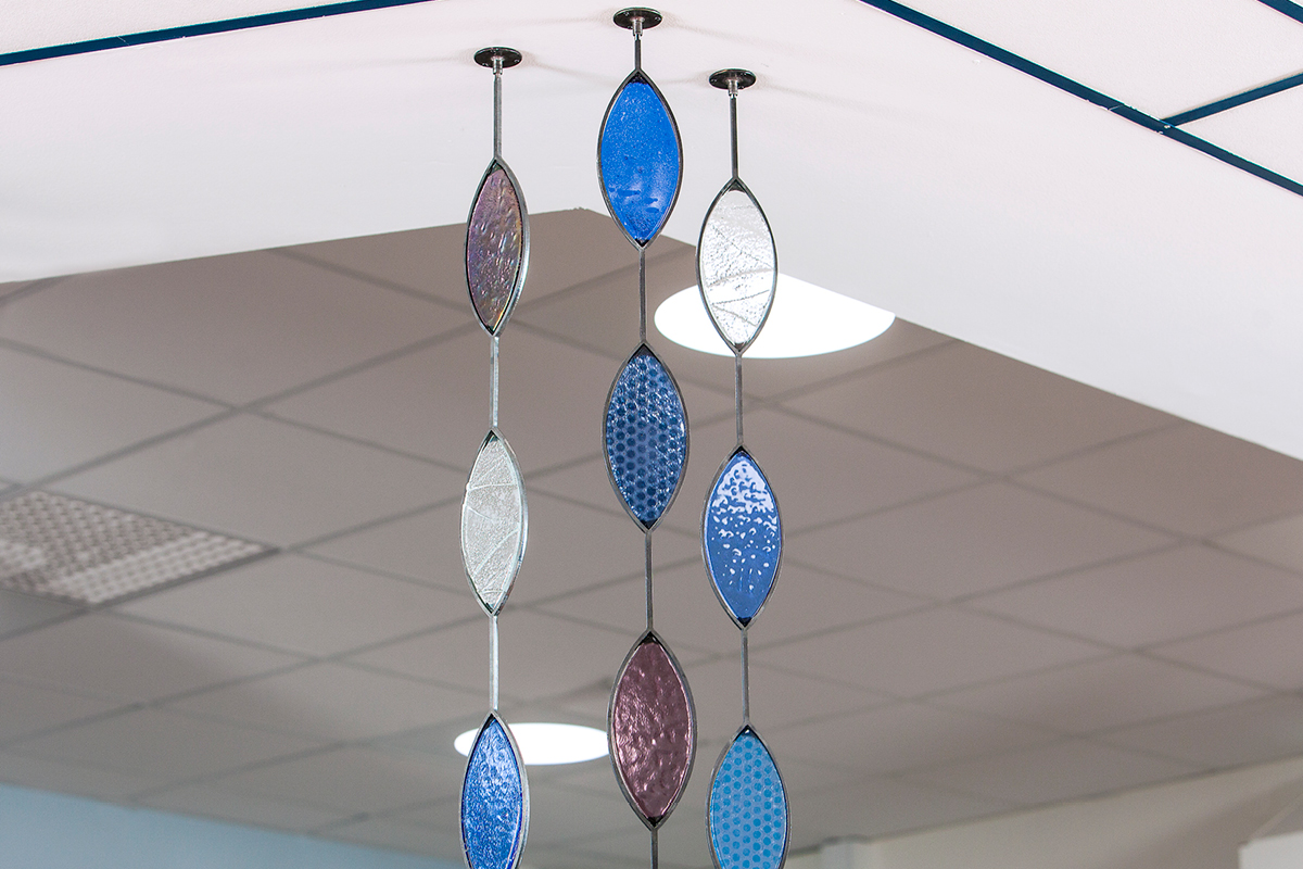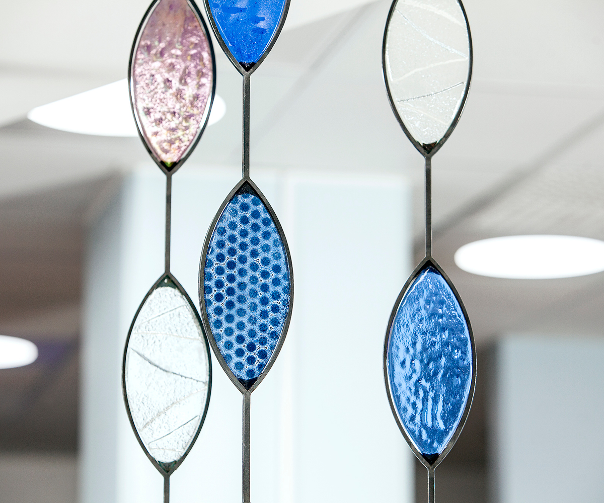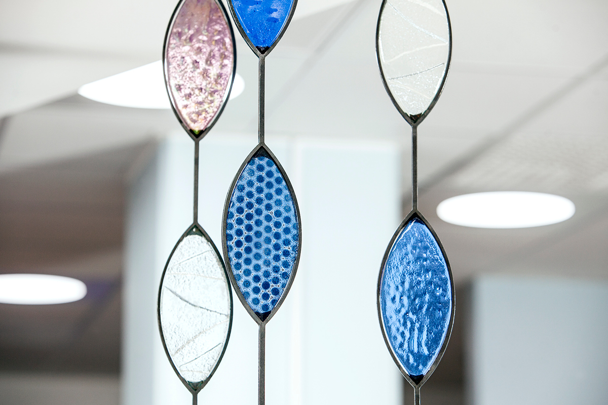 En lugn och vilsam avgränsning från disk och korridor på IVA avdelningen. Lövformationer i fusingteknik med reliefer och mönster i glasfärg. Glaslöven är infattade i laserutskurna järnramar.