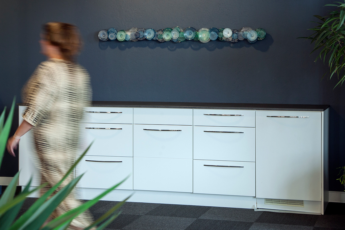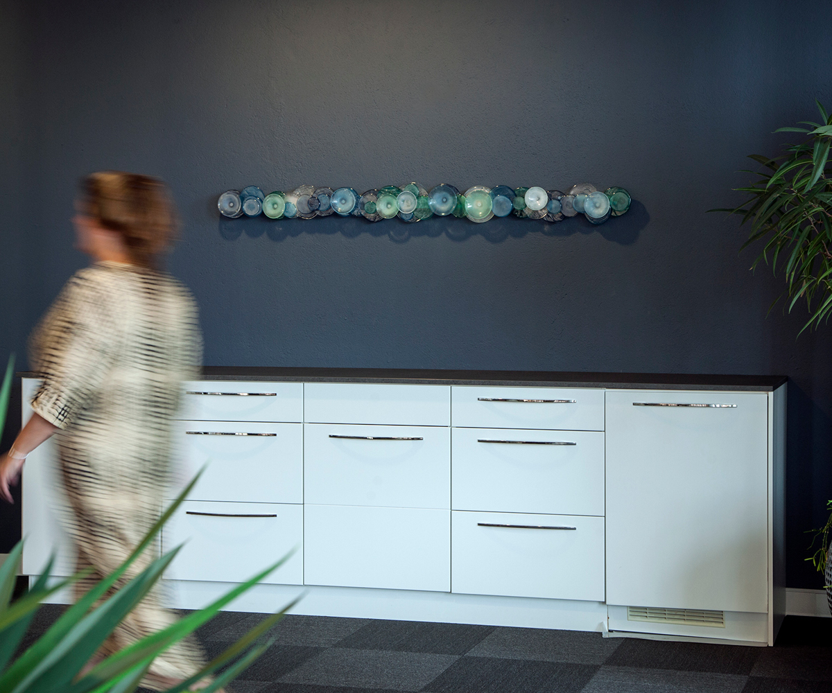 Habiliteringen i Karlskrona gav mig i uppdrag att gestalta deras väntrum. Hit kommer föräldrar med sitt barn för utredning och behandling. Jag ville skapa en färgglad upplevelse i det tomrum som uppstod i ett fönster i väntrummet ut mot ingången. Blåsta former i regnbågens alla färger. Gjorde här även sex tavlor, s.k Frökapslar i en korridor.