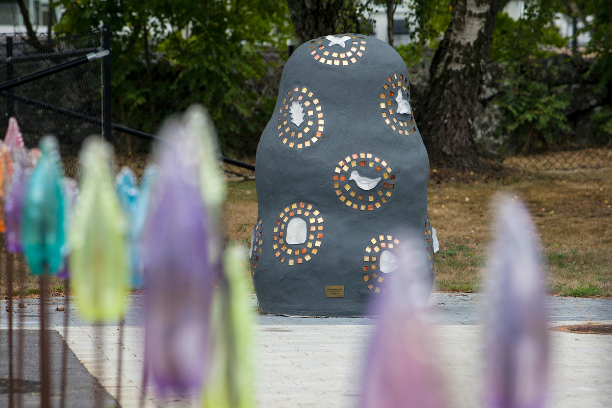 Friskolan Tant Grön gav mig i uppdrag att göra en välkomnande entré för de minsta barnen på skolan. Jag valde att göra två fruktspett, liknande de Baloo i Djungelboken jonglerar med. De består av frihandsblåsta olikfärgade glasformer med påklipp, stående på betongfundament som kaklats med egenhändig framställd glasmosaik. Lekfullhet och igenkänning präglar denna gestaltning.